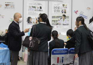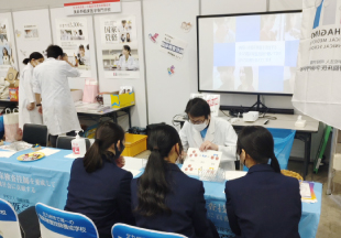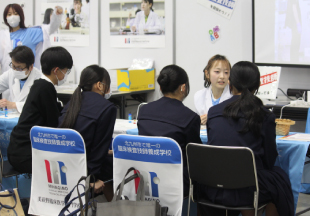 本校は臨床検査技師の仕事を紹介するブースを設営し、肺活量の測定、血液型検査体験、顕微鏡で見るがん細胞や寄生虫卵、感染予防のための手洗いチェックなどを行いました。