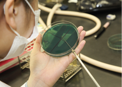 本学2年次の学内実習では、検査部門ごとに実習部屋割りを行い、学生が少人数のグループで各実習室を一定期間づつ回っていく「ローテーション実習」を実施しています。一定期間集中的に各検査部門の実習を行うユニークな方法をとっています。